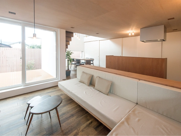 隣の窓から暖かい光が差し込むリビングにはL字の造作ソファを設置。